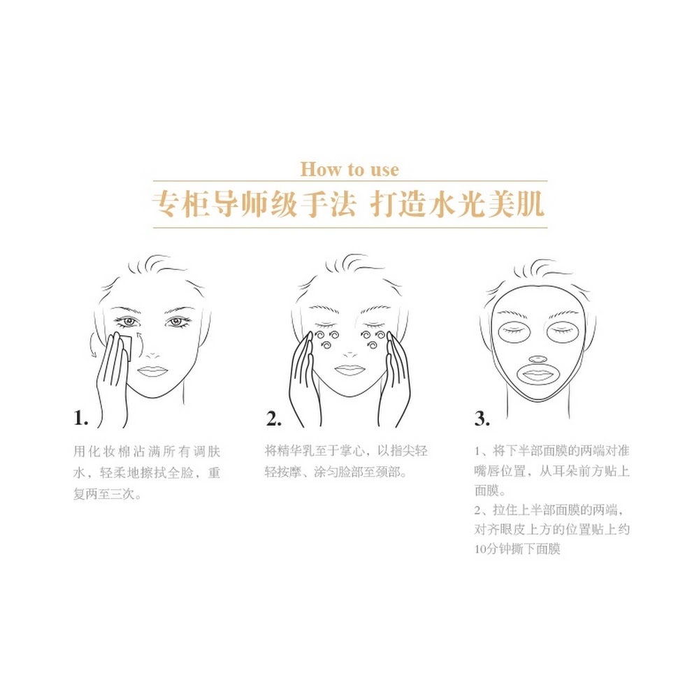 絲滑精華 分子微細 使肌膚亮澤彈性, 充滿水份。 分量充足配合面部按摩,加強吸收