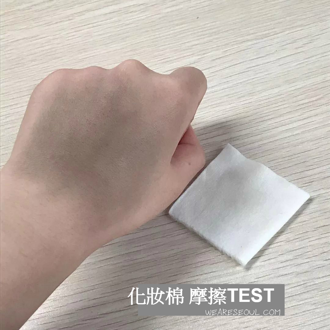 這裡用到一片乾淨的白色化妝棉,在塗滿髮際線粉的手背上進行反覆的摩擦。可以看到這片化妝棉,上面只有少量的灰色,而手背上的髮際線粉並沒有被卸除。
