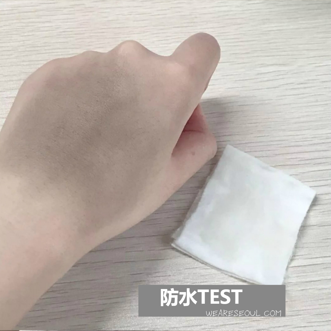 將清水倒在一塊乾淨的白色化妝棉上,對沾滿髮際線粉的手背進行擦拭。呈現出來的結果跟上面一樣,手背上的髮際線粉沒有被卸除,仍然完好保持。