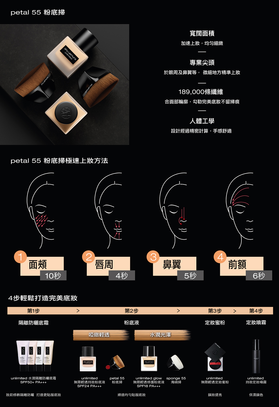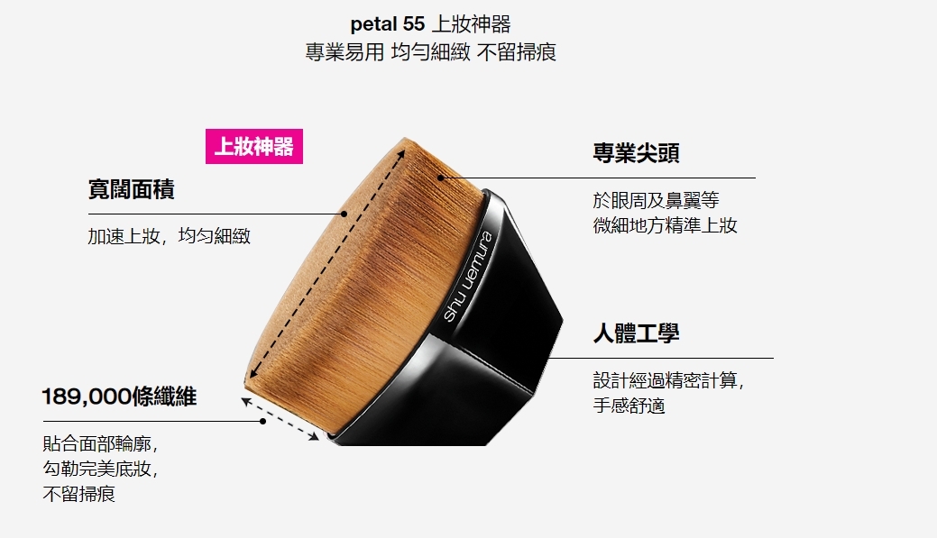 獨特的 petal 55 粉底掃能確保底妝均勻不留掃痕